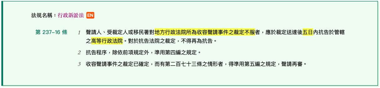 (C)聲請人等若對收容聲請事件之裁定不服者,應於裁定送達後 5 日內抗告於管轄之高等行政法院 行政訴訟法237-16