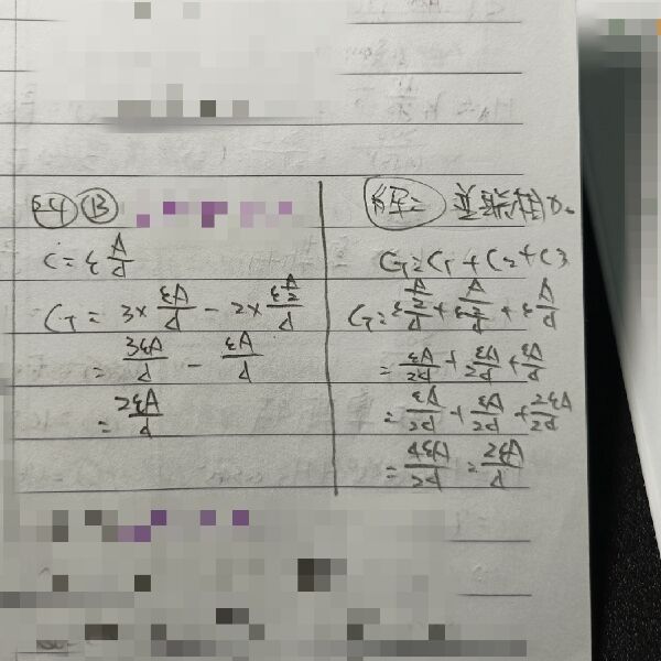 ,其餘極板面積為 A,板距皆為 d,板間介質的介電係數皆為 ,試問此 電容器的電容量為何?
