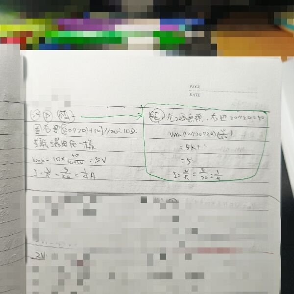 電阻全部並起來會變成 (10V,10歐姆) 退一層變成 10V,10歐姆// 10+10歐姆 ,並聯電壓相等 , 後面的10+10歐姆各得5V , 再退一層 得5/20 =1/4A