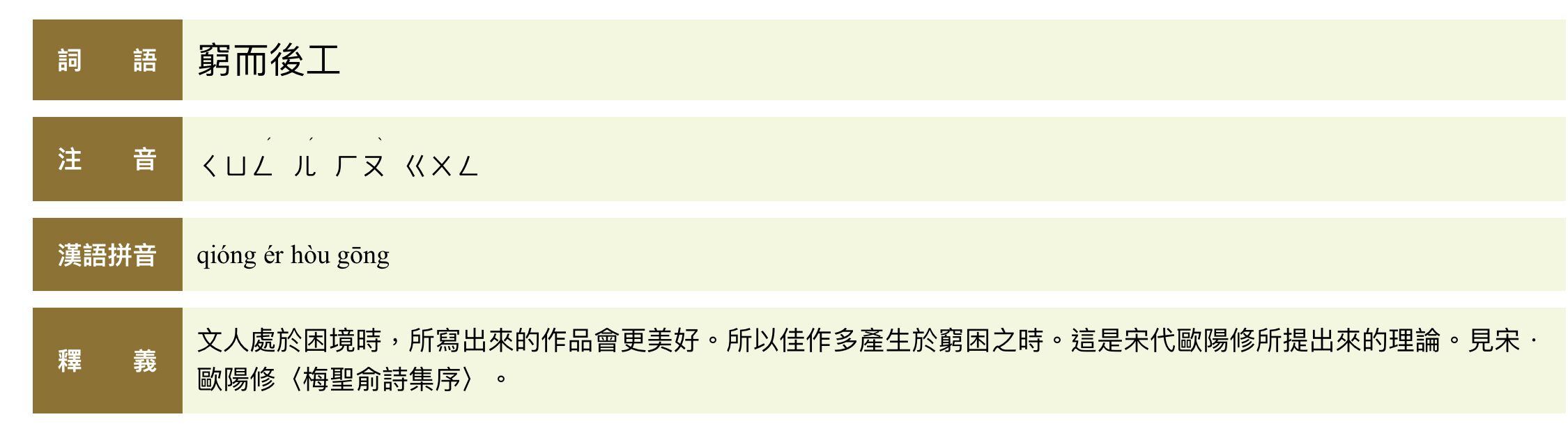 大文學家韓愈及歐陽修都曾提出「文窮而後工」的文學理念,意思是說,人在窮困之時,反而能將文章寫得非常的好,因為在困頓中所激發的潛力是非常驚人的,在不如意的環境中,反而能夠有一番作為。
