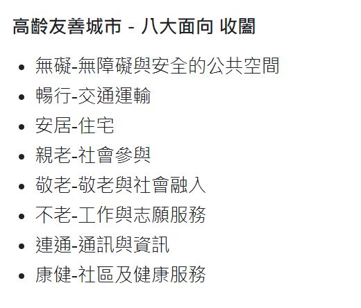 ①無障礙及安全空間②經濟扶助③交通運輸④社會參與⑤工作與志願服務⑥住宅⑦創新服務