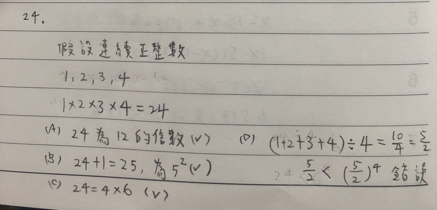 24. 下列關於 4 個連續正整數的乘積,何者錯誤?
