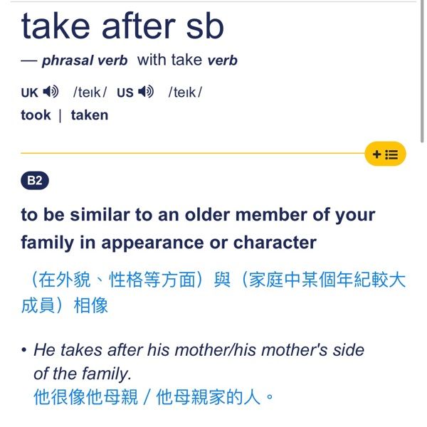 take after sb (在外貌、性格等方面)與(家庭中某個年紀較大成員)相像