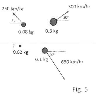 24.A 0.5-kg bullet is flying toward east (→) with a speed of 200 km/hr and suddenly blows up itself into four pieces. The mass of these four and the flying speeds and directions of three pieces are shown in Fig. 5. Please find the speed and direction of the last one.