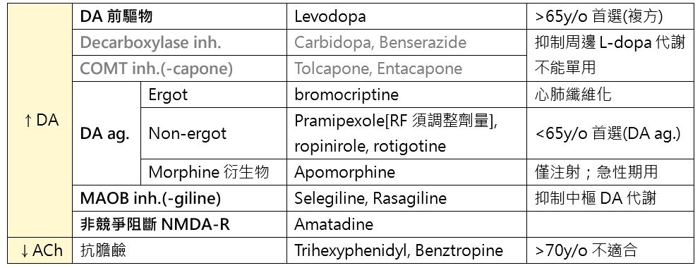 | decarboxylase inhibitor | Benserazide,Carbidopa | 抑制周邊L-dopa代謝 | 不可 單獨使用 |