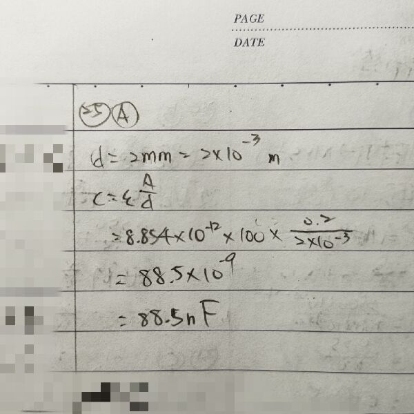 25 一圓形電容器其面積為 0.2 m2,上下平行板電極之距離為 2 mm,介質的相對介質係數(relative permittivity)εr = 100,此電容器之電容值為何?(