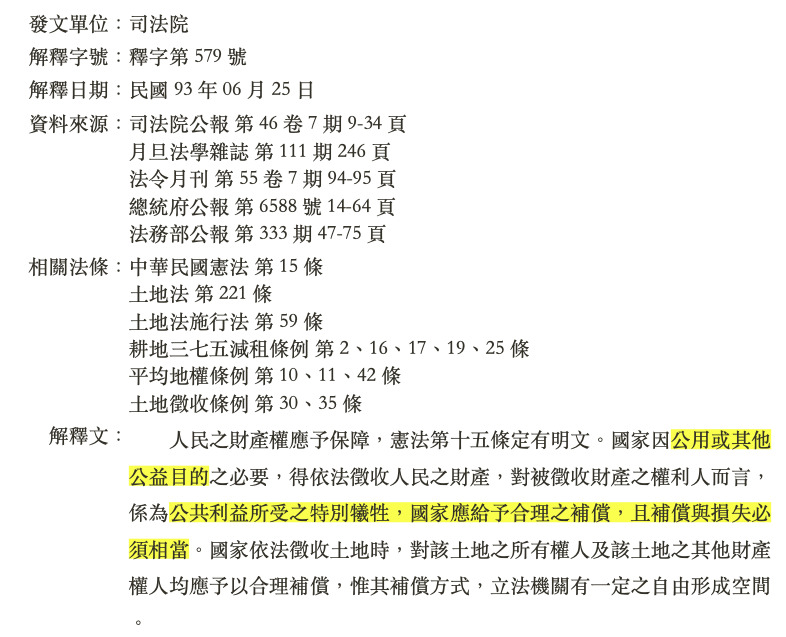釋字732-理 由 書: 憲法第十五條規定人民財產權應予保障,旨在確保個人依財產之存續 狀態行使其自由使用、收益及處分之權能,並免於遭受公權力或第三人之 侵害,俾能實現個人自由、發展人格及維護尊嚴(本院釋字第四○○號及 第七○九號解釋參照)。人民依法取得之土地所有權,應受法律之保障與 限制,亦為憲法第一百四十三條第一項所明定。又人民居住自由亦屬憲法 第十條保障之範圍。國家徵收人民土地,不但限制人民財產權,如受徵收之土地上有合法居住者,亦嚴重影響其居住自由。徵收人民土地除應對土地所有權人依法給予合理及迅速之補償外,自應符合公用或其他公益目的之必要,始無違於憲法第二十三條之規定。