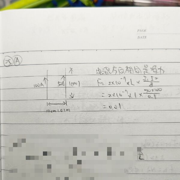 25 若有兩平行導線長度均為 1 公尺,相隔 10 公分,其電流分別為 50A、100A,且方向相同,求每根導