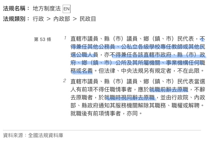 直轄市議員、縣(市)議員、鄉(鎮、市)民代表,不得兼任其他公務員、公私立各級學校專任教師或其他民選公職人員,亦不得兼任各該直轄市政府、縣(市)政府、鄉(鎮、市)公所及其所屬機關、事業機構任何職務或名義。但法律、中央法規另有規定者,不在此限。