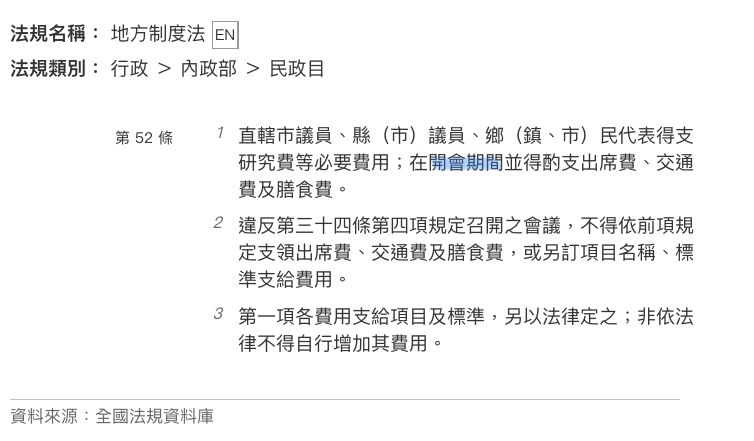 地方制度法 第 52 條 直轄市議員、縣(市)議員、鄉(鎮、市)民代表得支研究費等必要費用;在開會期間並得酌支出席費、交通費及膳食費。