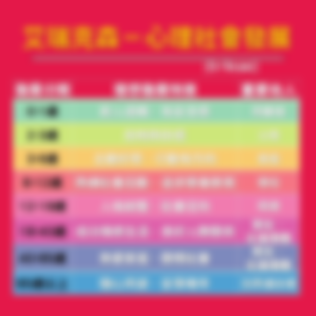 18-35歲 | 成年期前期 | ●發展任務:【親密or孤立】 發展任務是形成親密關係,如果未形成親密關係,將導致疏離與孤獨。 |