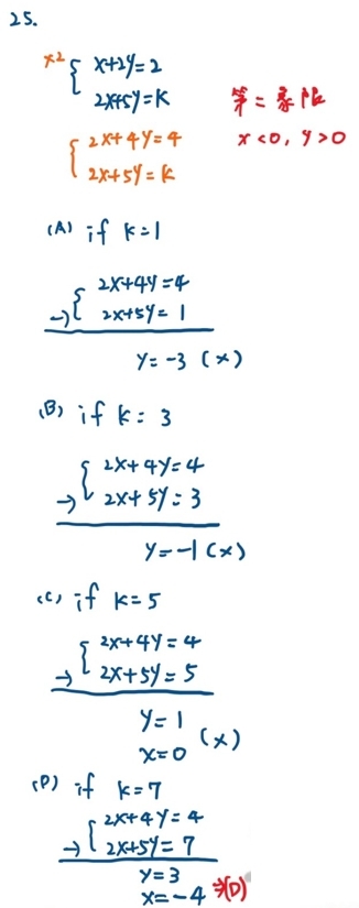 25.坐標平面上兩直線 x+2y=2 與 2x+5y=k 的交點在第二象限,下列何者可能是 k 的值?