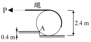 25. 如右圖所示,有一直徑2.4 m且重量30 kN的圓柱體被牽繩拉引上高0.4 m的台階,當圓柱體恰離開底部水平面達平衡時 ,此時台階A點處的反力為何?