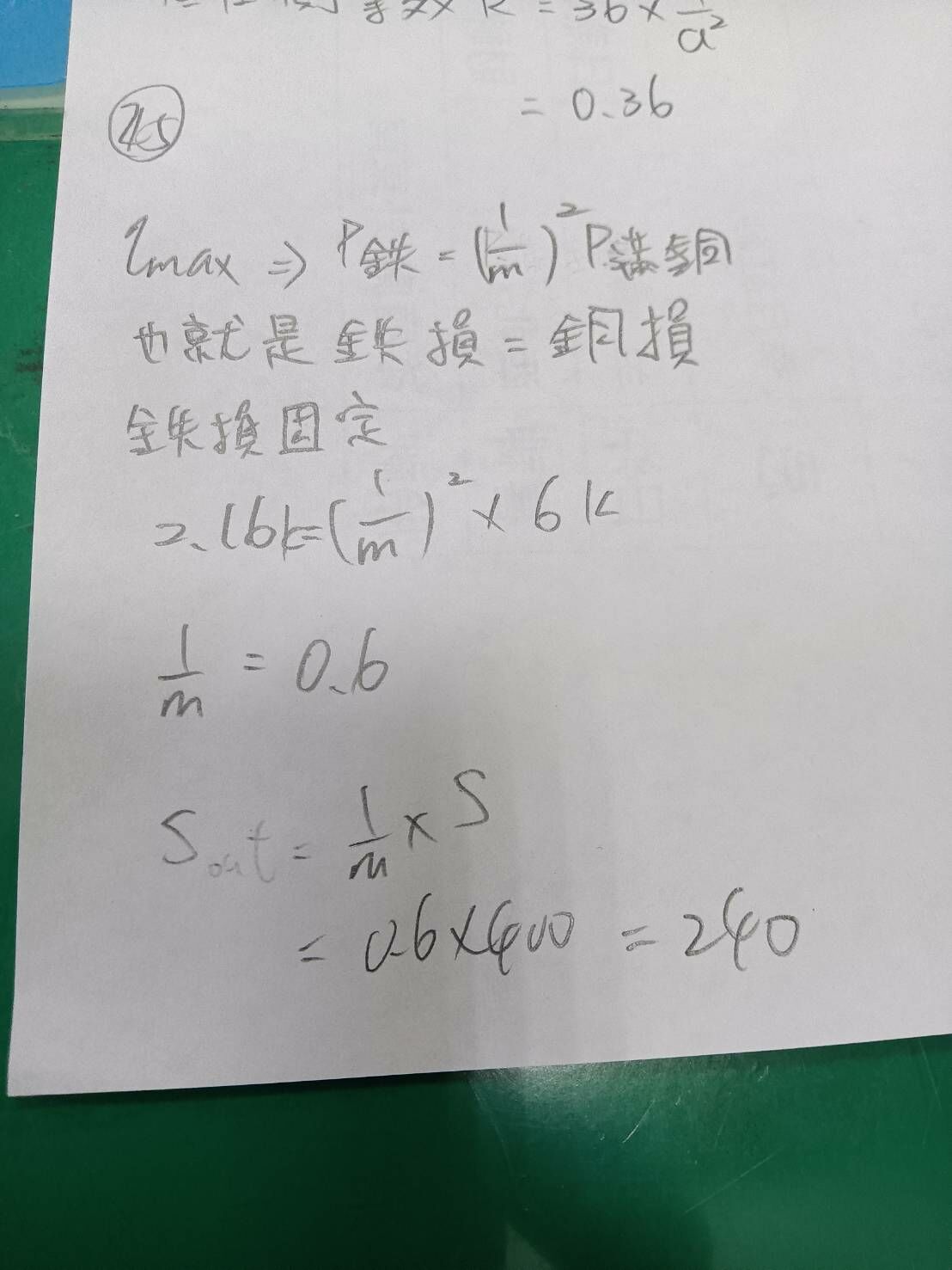 25. 有一部 2200 V / 110 V、400 kVA 之單相變壓器,滿載時銅損為 6 kW,鐵損為 2.16 kW,則效率最大時之輸出容量 S 為何?