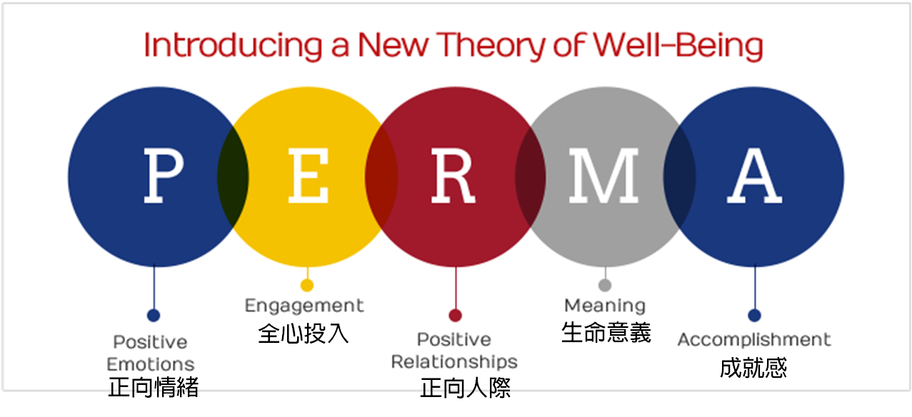 P. E. R. M. A. 是指幸福感理論所組成的五大元素。此理論由塞利格曼 (Seligman)所提出,他認為這五種元素都是我們身心健康的基本要素,對我們的健康、幸福和生活滿意度起著重要的作用。以下將會逐一介紹P. E. R. M. A.五大元素的概念: