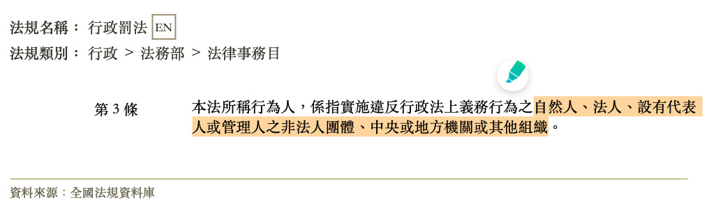 第3條本法所稱行為人,係指實施違反行政法上義務行為之自然人、法人、設有