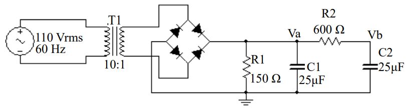 26 圖為一個電容式全波整流電路再接一個 RC 濾波電路,針對 R2 和 C2 形成的 RC 濾波電路之敘述, 下列何者正確?(A)為高通濾波電路 (B)增益大於 1 (C)加入此 RC 濾波電路,Vb 的漣波電壓小於 Va 的漣波電壓 (D) R2 和 C2 形成的 RC 濾波電路的轉折頻率為 70 Hz
