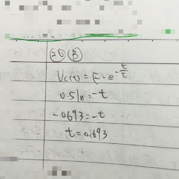 26 RC 串聯電路之電容器放電過程中,經過多少倍的時間常數,電容器電壓將變為初始電壓之 50%?
