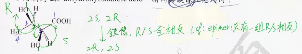 26. 下圖化合物之 IUPAC 名稱為 2,3-dihydroxybutanoic acid,請問其鏡像組態為何?