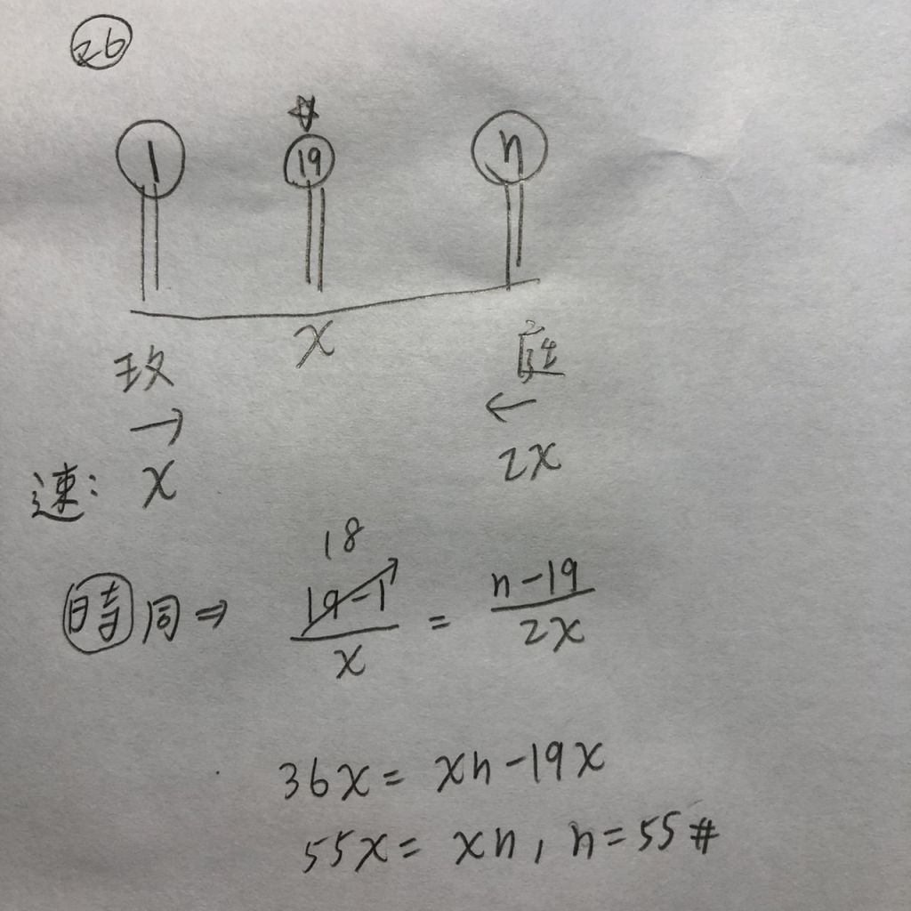 26. 如下圖,某直線道路旁有一排樹,相鄰兩棵樹之間的距離都相等,今分別 依序編號為第 1 棵、第 2 棵、第 3 棵、……、第 n 棵。若小玫與阿庭同時出 發,阿庭走路的速率是小玫的 2 倍,小玫由第 1 棵往第 n 棵走,阿庭由第 n 棵往第 1 棵走,而且兩人恰好在第 19 棵樹相遇,則 n 之值為何?