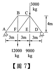 26. 如右【圖7】之桁架,下列敘述何者錯誤?(C:壓力,T:張力)(A) DE 桿件的內力為 9000 kg ( C )(B) AF 桿件的內力為 9000 kg (T)(C) BC 桿件的內力為 9000 kg ( C )(D) AB 桿件的內力為 15000 kg ( C )