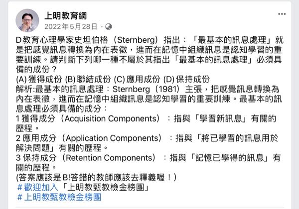 40.教育心理學家Sternberg指出:「最基本的訊息處理」就是把感覺訊息轉換為內在 表徵,進而在記憶中組織訊息是認知學習的重要訓練。請判斷下列那一種不屬於 其指出「最基本的訊息處理」必須具備的成份?
