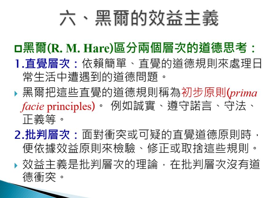 26. 黑爾(R. M. Hare)認為大部分的人在日常生活中思考道德問題的方式是遵循直覺的道德規