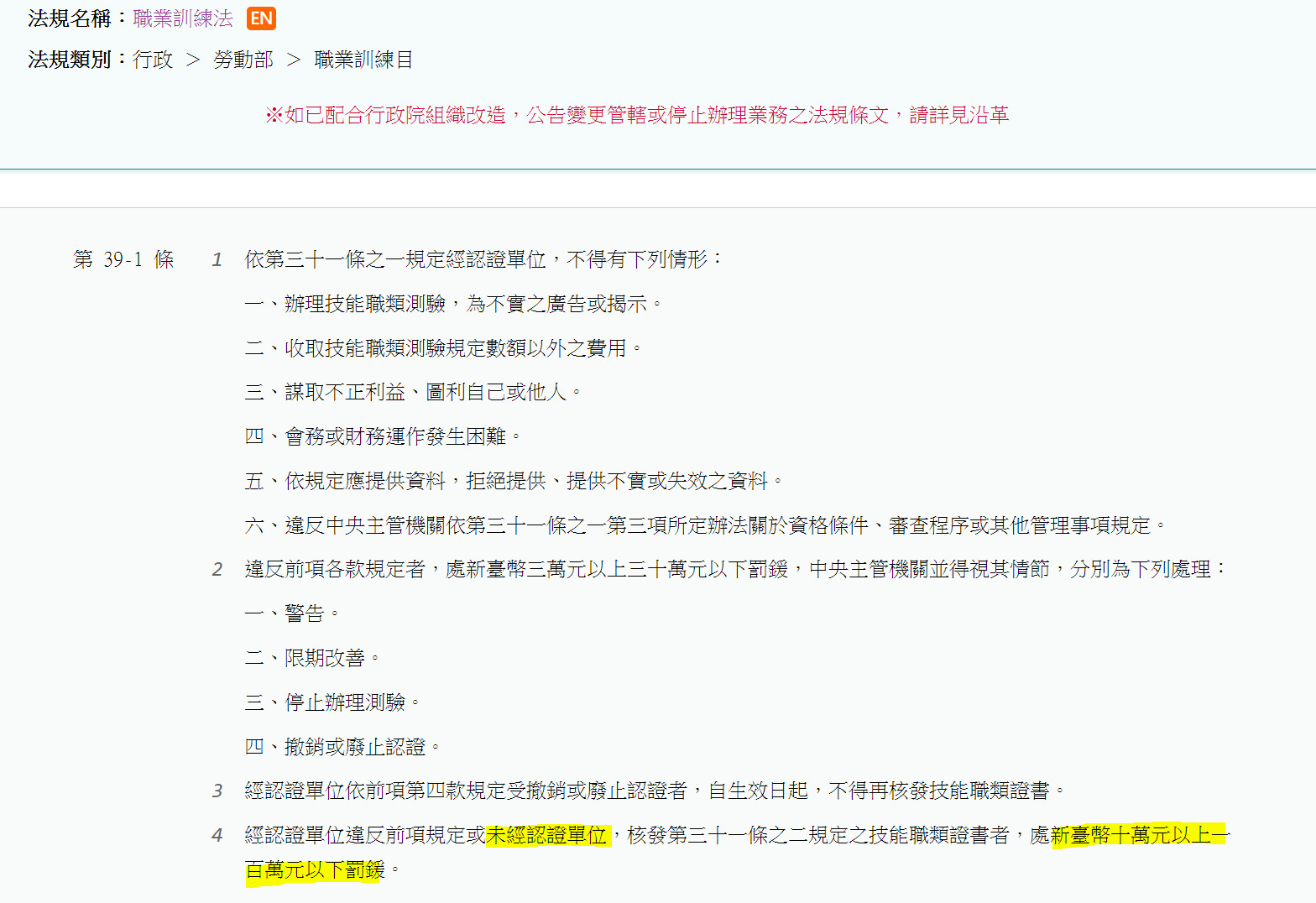 26. 依職業訓練法規定,未經技能職類測驗能力認證而核發技能職類證書之機構,依法應處以新臺幣 多少元之罰鍰?