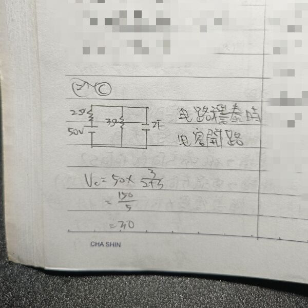 27 有一 50 V 之電壓源,串聯 2 Ω 電阻後,再連接至 3 Ω 電阻和 2 F 電容之並聯電路,當電路達穩定時 電容器之電壓為何?