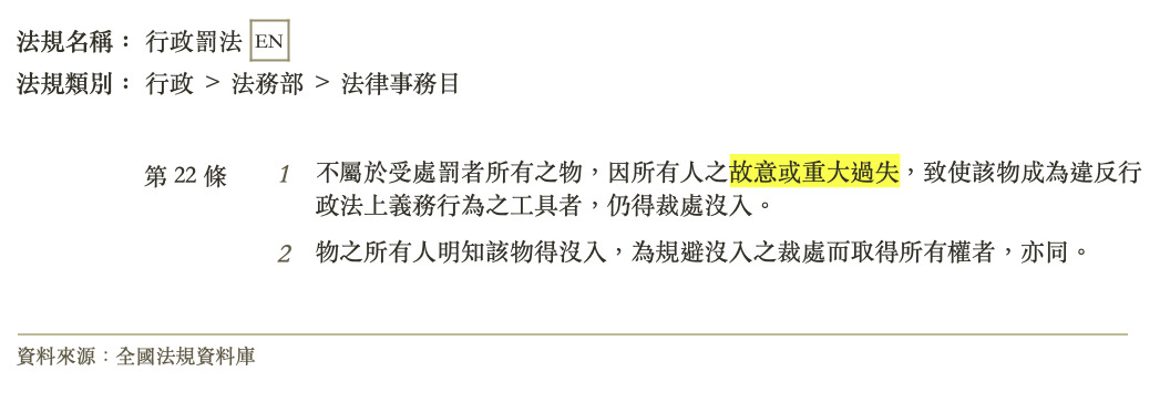 不屬於受處罰者所有之物,因所有人之故意或重大過失,致使該物成為違n反行政法上義務行為之工具者,仍得裁處沒入。n物之所有人明知該物得沒入,為規避沒入之裁處而取得所有權者,亦同。不屬於受處罰者所有之物,因所有人之故意或重大過失,致使該物成為違n反行政法上義務行為之工具者,仍得裁處沒入。n物之所有人明知該物得沒入,為規避沒入之裁處而取得所有權者,亦同。n |