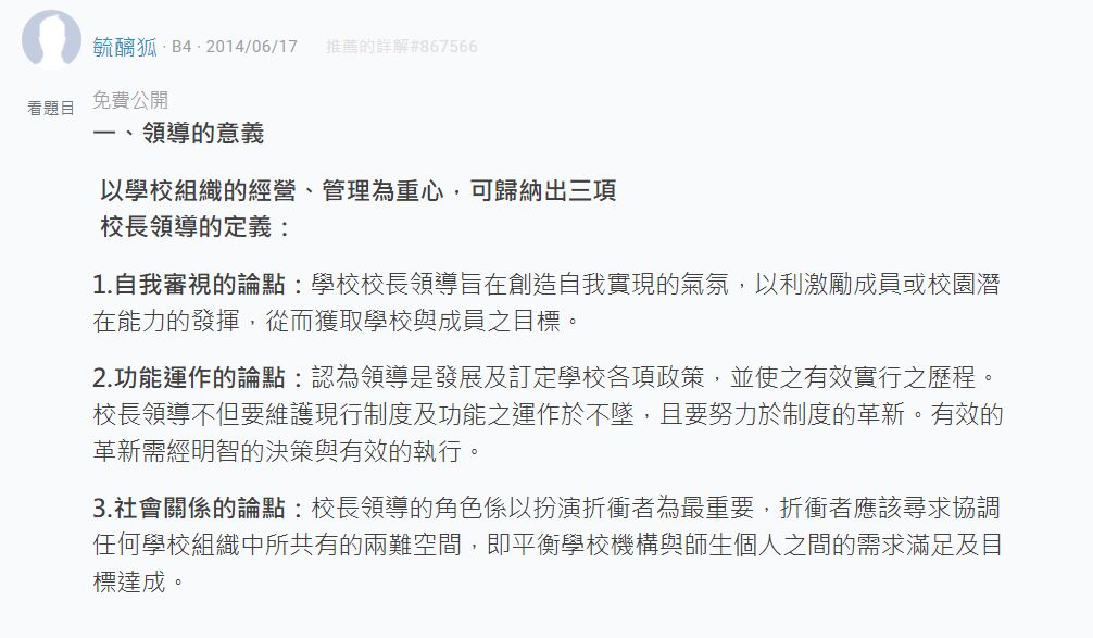 題目→將學校行政領導定義為:「發展、訂策及其有效實施之歷程。」