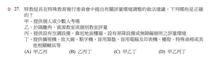 27. 特教組長在特殊教育推行委員會中提出有關評量環境調整的做法建議,下列哪些是正確 的? 甲、提供個人或少數人考場 乙、於隔離角、資源教室或個別教室評量 丙、提供設有空調設備、靠近地面樓層、設有昇降設備或無障礙廁所之評量環境 丁、提供擴視機、放大鏡、點字機、盲用算盤、盲用電腦及印表機、檯燈、特殊桌椅或其 他相關輔具等