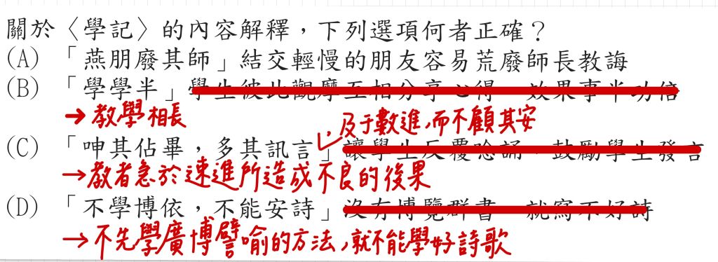 (C)「呻其佔畢,多其訊言」讓學生反覆唸誦,鼓勵學生發言
