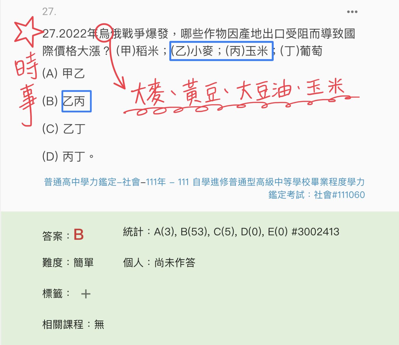 27.2022年烏俄戰爭爆發,哪些作物因產地出口受阻而導致國際價格大漲? (甲)稻米;(乙)小麥;(丙)玉米;(丁)葡萄