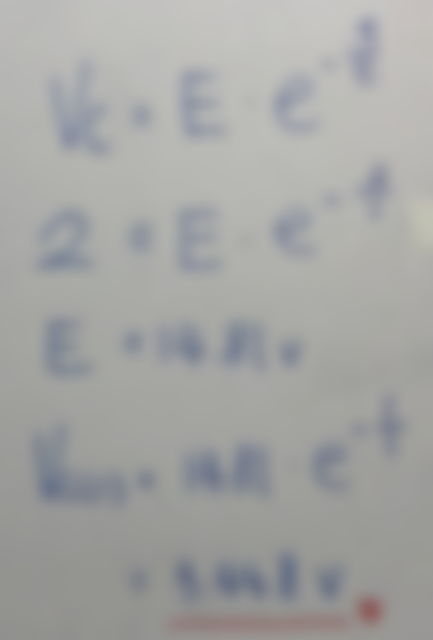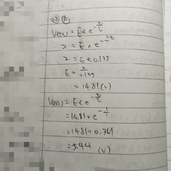 28 一 RC 電路之時間常數為 1 秒,已知電容處於放電狀態,在 2 秒時電阻之電壓為 2 V,則 1 秒時電阻 之電壓約為多少?