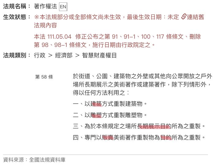 於街道、公園、建築物之外壁或其他向公眾開放之戶外場所長期展示之美術著作或建築著作,除下列情形外,得以任何方法利用之︰
