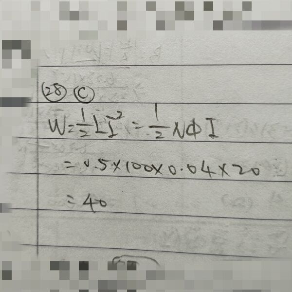 28 線圈匝數為 100 匝之電感器,當通以 20 A 之電流時,產生 0.04 Wb 的磁通,則此時電感器所儲存之