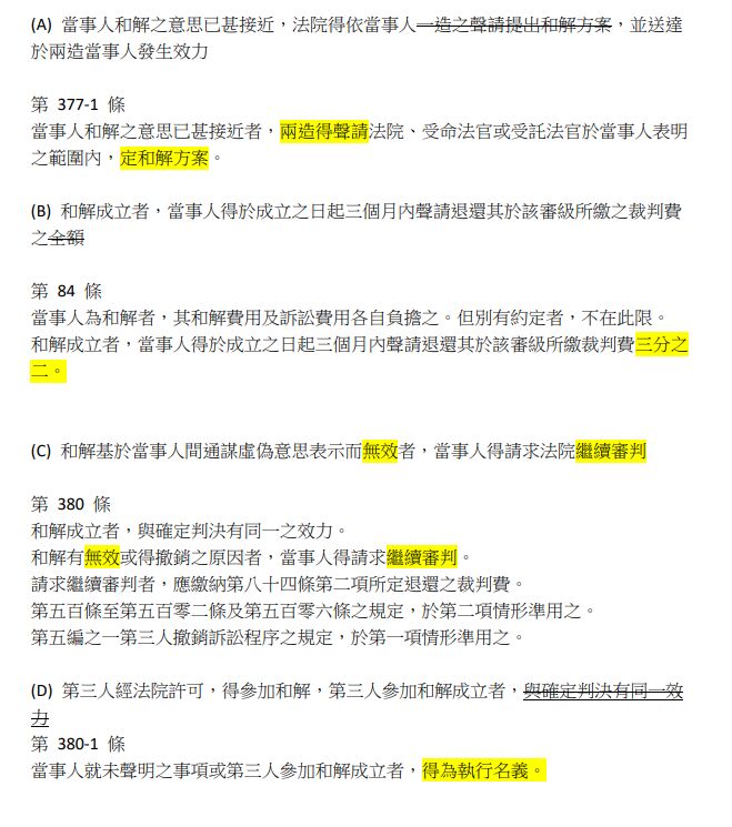 (C)和解基於當事人間通謀虛偽意思表示而無效者,當事人得請求法院繼續審判