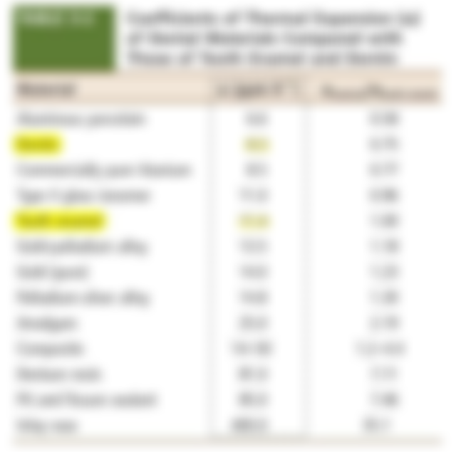 Coefficient of thermal expansion: Resin(30)>Amalgam(25)>Gold(13)>Enamel(11.4)>GI(10)>Ceramic(6)