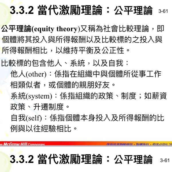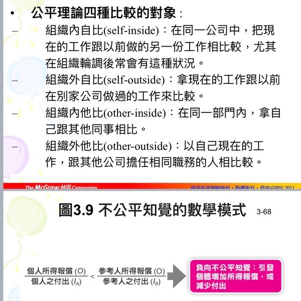 2.所謂公平或正義與否的知覺畢竟很主觀,不易控制,很多人總是看不到別人的付出與貢獻,總覺得自己做的比別人多,比別人有價值。主管必須持續溝通這方面的訊息,讓員工知道自己的付出與回報跟別人相較下是多還是少。害怕當壞人,不敢讓員工對自己的付出有正確的認知,他們永遠會覺得自已比其它人貢獻更多。與其“齊頭式平等”的分配公平。不如開誠佈公地讓員工知道遊戲規則,達到程序公平!