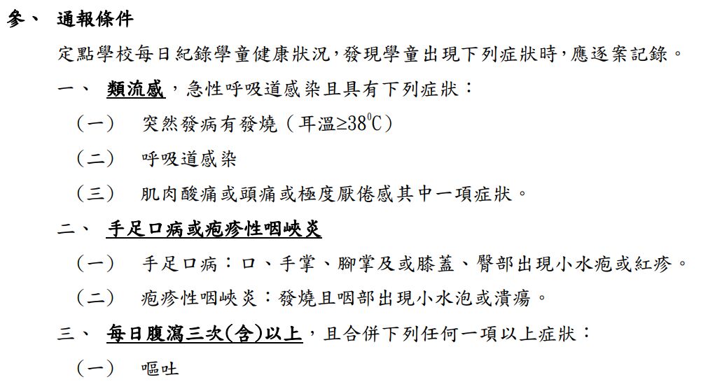 依據衛生福利部疾病管制署所訂定的「學校傳染病監視作業注意事項」的內容中提到: