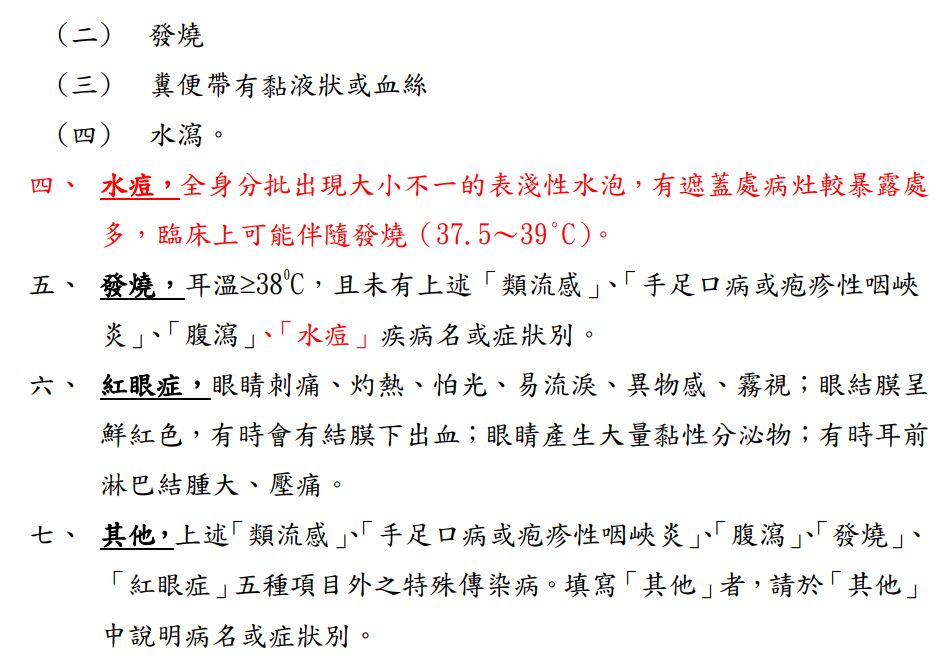甲、發燒且咽部出現小水泡或潰瘍。乙、一日腹瀉三次(含)以上並合併嘔吐。