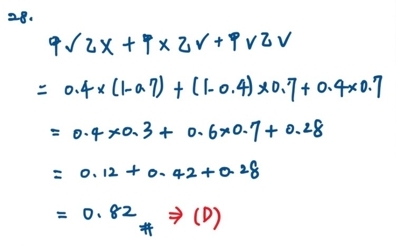 28.甲、乙兩人射擊的命中率分別為 0.4、0.7,今有一靶飛入射程內,兩人同時射靶,則此靶被命中的機率為何?