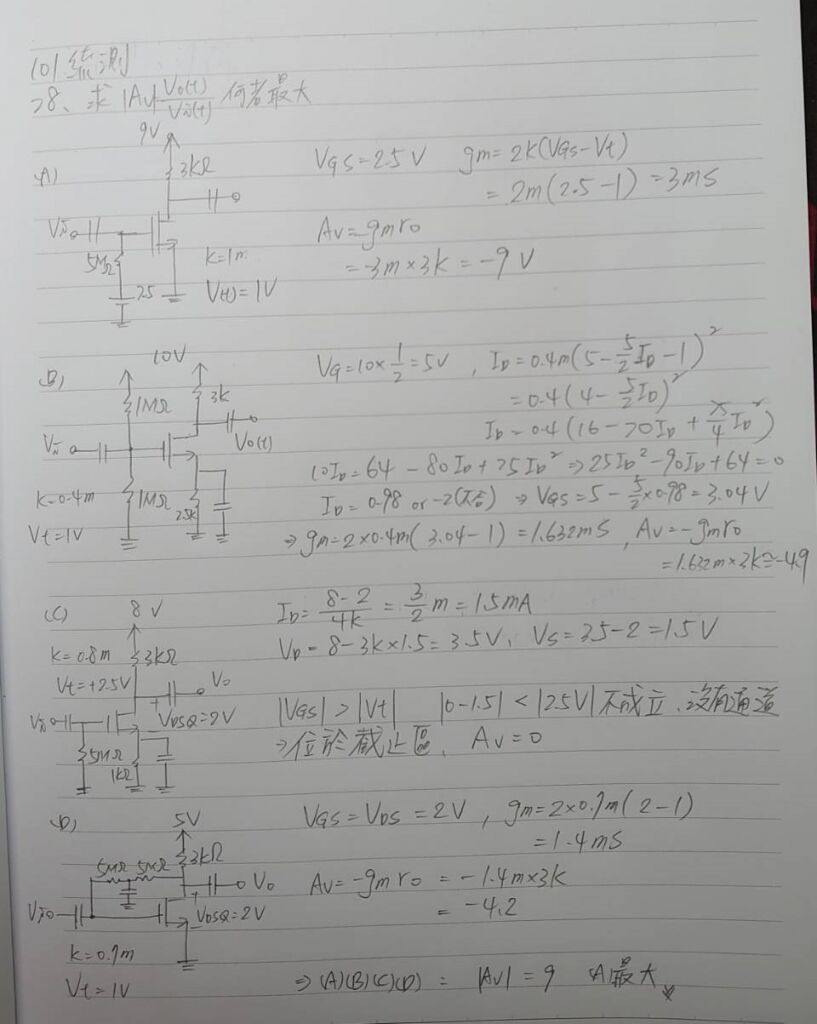 ,VDSQ為 FET的汲極與源極間的直流工作電壓,假設四個 FET的歐力電壓皆為∞ , Av=V0(t)/Vi(t) 為小信號電壓增益,試問下列何者可得最大的電壓增益 |AV| ?