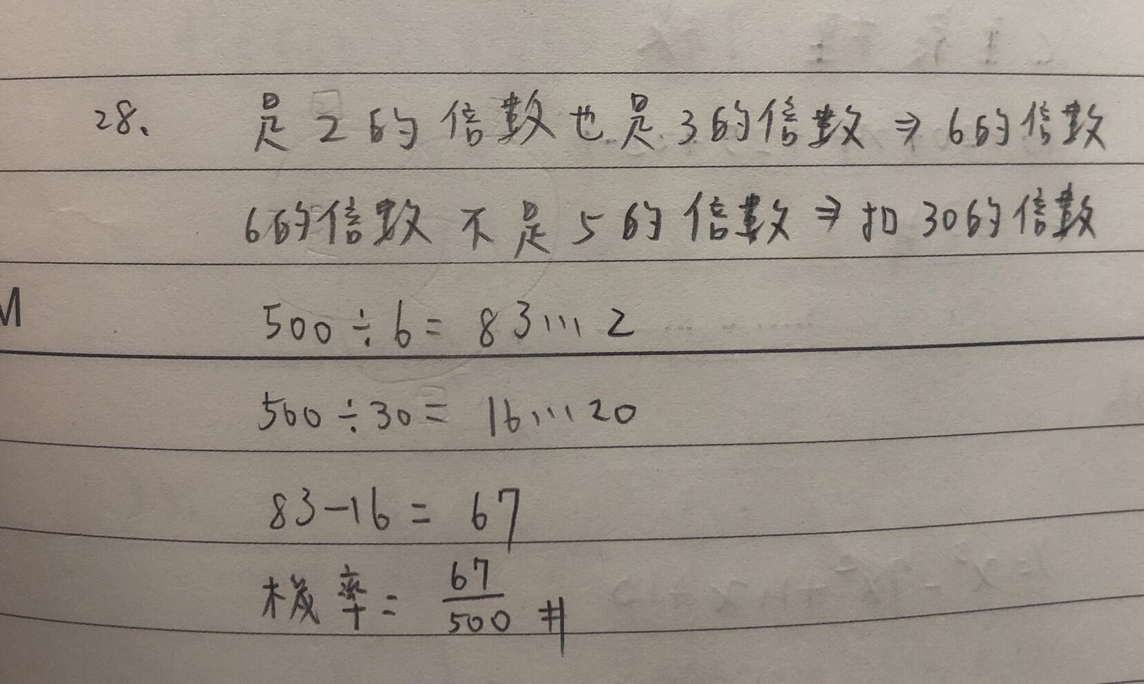 28. 從正整數 1~500 中,隨機抽出一個數字,該數字是 2 的倍數,也是 3 的倍數,但不是 5 的倍數的機率是多少?