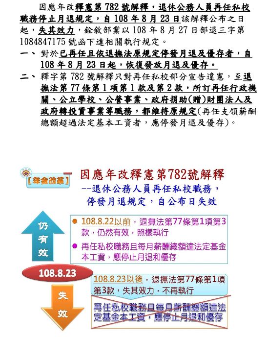 →第77條第1項第3款規定與憲法保障平等權之意旨有違 ∵ 並非所有再任職於私立學校者,都會發生上述從政府實際領受雙薪之問題,一律停止再任私立學校職務領有超過法定基本工資之受規範對象,領受月退休金權利,其所採分類標準顯然涵蓋過廣,尚難謂與防止從政府實際領受雙薪目的之達成間具有實質關聯,又對於同樣受有政府獎補助之其他私人機構擔任全職之受規範對象,並未停止其繼續領受月退休金之權利。且退休公務人員本得自由選擇領取一次退休金或月退休金,二者僅有領取方式之差異,然其本質上均為退撫給與,則無不同。上開規定僅限制支(兼)領月退休金之公務人員領受月退休金權利,而不及於領取一次退休金者,其分類標準,顯然涵蓋過窄,亦尚難謂具有實質關聯。綜上,停止再任私立學校職務受有超過法定基本工資之受規範對象,領受月退休金權利規定,與憲法保障平等權之意旨有違