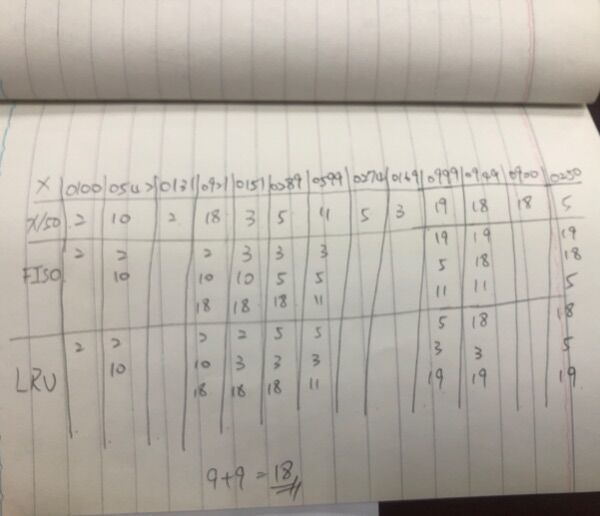 大小為 50 個位元組(Byte),亦即分頁 0 的位址範圍是 0-49,分頁 1 位址範圍是 50-99,以此類推。若追 蹤一程序的執行,其存取記憶體的位址順序如下: 0100, 0542, 0131, 0921, 0151, 0289, 0599, 0274, 0169, 0999, 0949, 0900, 0250。分配給該程序的實體記憶體固 定為 3 個框(Frame) ,且分別採取先進先出(First In First Out, FIFO)以及近來最沒有使用(Least Recently Used, LRU)兩個演算法來進行分頁置換(Page Replacement),則這二個演算法所產生之分頁錯誤(page fault)次數總和為何?