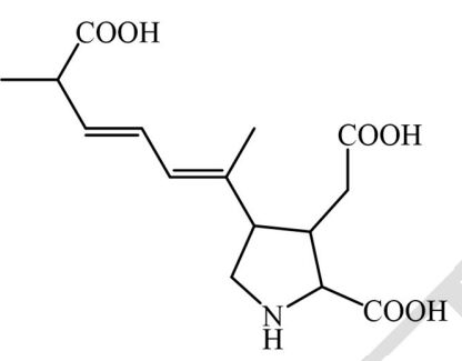 29.矽藻會產生一種具有神經刺激性的小分子毒素(Domoic acid),請問 Domoic acid 具有幾個 對掌中心(chiral center)? (A) 2 (B) 3 (C) 4 (D) 5