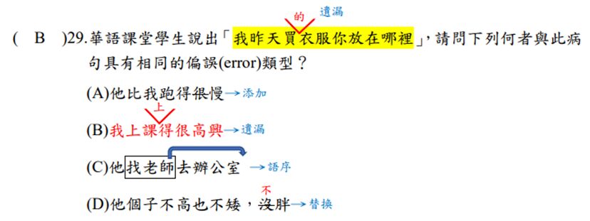 29.華語課堂學生說出「我昨天買衣服你放在哪裡」,請問下列何者與此病句具有相同的