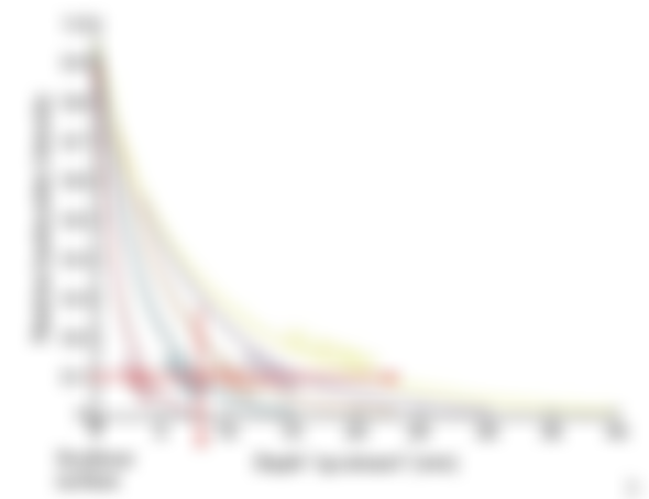 29.頰黏膜腫瘤以9 MeV電子射束體外照射治療,若臉頰腫瘤厚度為 3 cm,為避免對側口腔黏膜接受照射而使用 鉛作為內屏蔽,若欲降低回散射至原來的10%以下,則應在此內屏蔽與組織介面至少添加多少 cm 的等組織材料?(參考下圖作答)